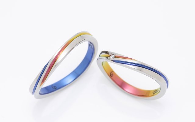 2本のラインが交差するデザインと、お互いを象徴するカラーの組み合わせ。まるでふたりの出会いを表すような指輪です。