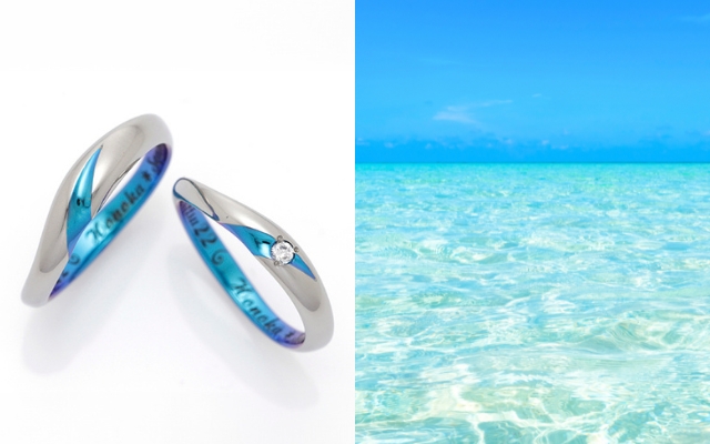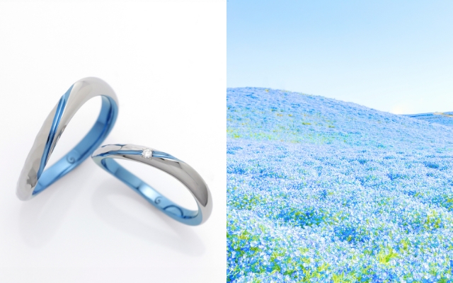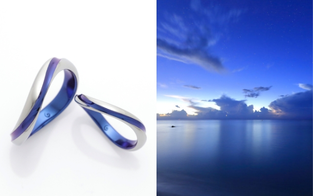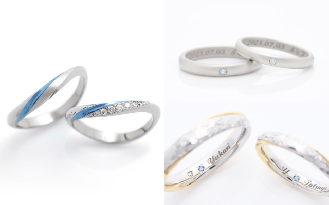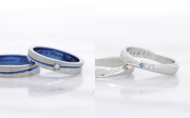 ゆるやかなウェーブや細身のストレートといった王道の指輪に、ワンポイントでさりげなくブルーを取り入れて。気品のある、普遍的な美しさを求めるおふたりにおすすめです。
