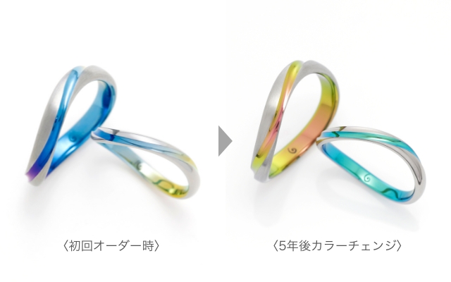 メンテナンスによって、その時々のおふたりに合わせたカラーに変えることができます。上の画像のように、形状はまったく同じでもカラーチェンジで印象が大きく変わりますよ。カラーリフォームについて