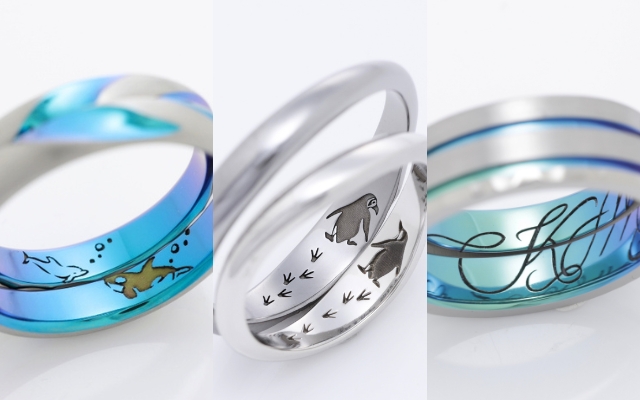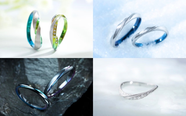 指輪をくるくる回すと、青色〜オレンジ色へ変化するグラデーションカラーによって空の美しい表情を楽しむことができます。大切な思い出とこれから始まる二人の新たな未来を祝福するようなデザインに仕上げました。