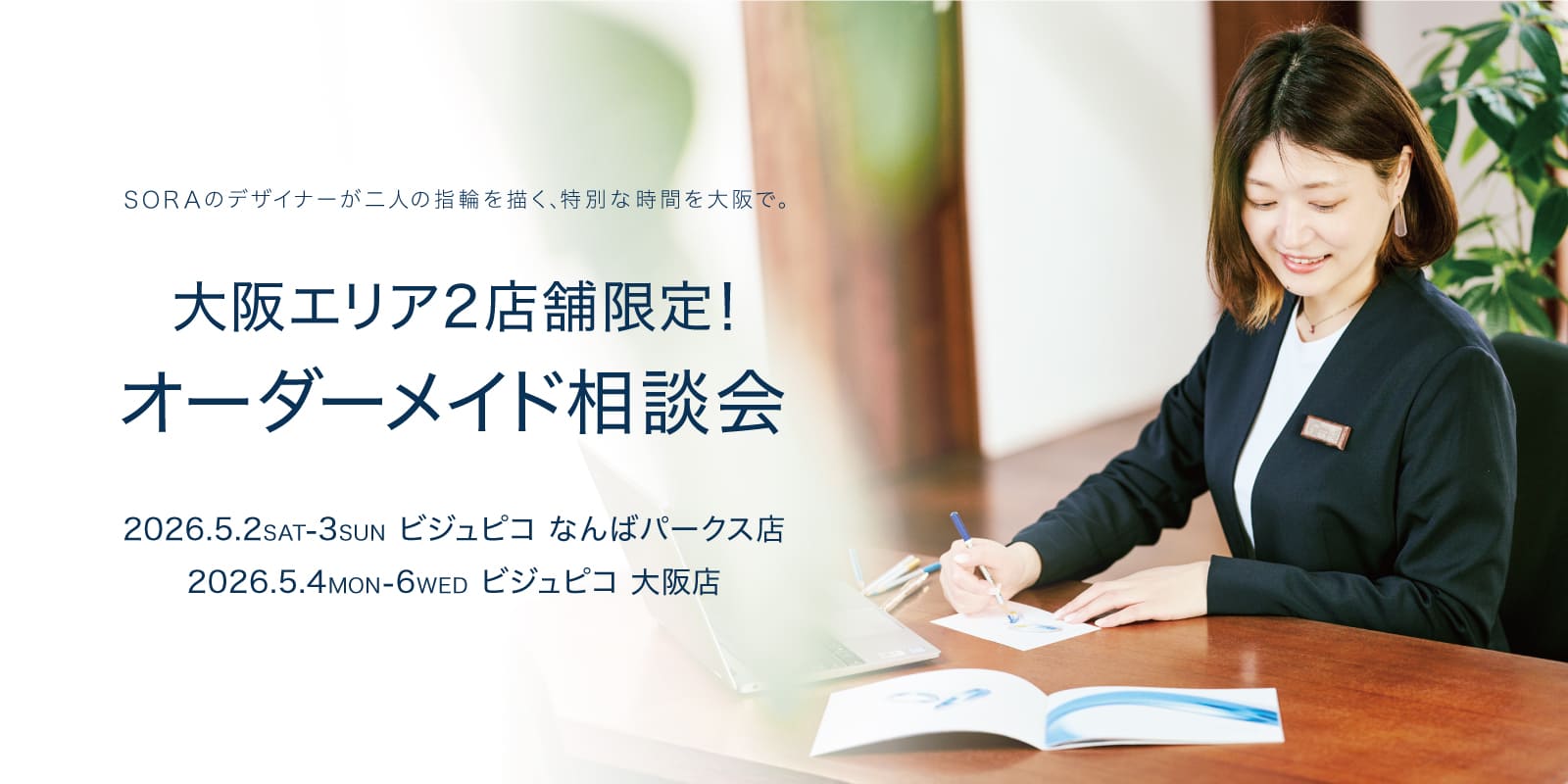 「まずはSORAの指輪を見てみたい、どんなことができるのか知りたい、というご来店も大歓迎です!ほとんどの方が婚約・結婚指輪選びは初めてのことですし、ジュエリーショップに訪れることも緊張すると思います。お二人にとってどんな指輪が『自分たちらしい』と思えるか、一緒に考えましょう!」