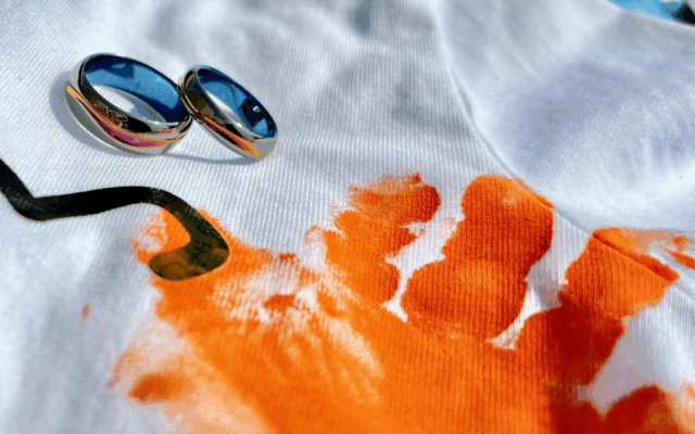 夫と、お互いの推しのメンバーカラーと好きな色を組み合わせて、グラデーションにしました!全く違う色を選んだのに、指輪を重ねると青で繋がるデザインになっているところがポイントです!