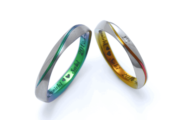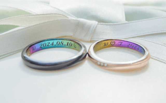 お揃いの裏側の虹色カラー、それぞれの指輪の外側が黒とピンクにしたことも、仕上げが艶消しと艶ありの感じもお気に入りです。