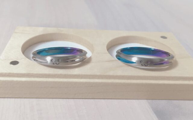 結婚指輪らしくないデザインと、指輪にチェーンを通して指輪とネックレスに出来る2WAY仕様になっていることです。内側にお互いのイメージキャラクターのカエルも刻印しました。
