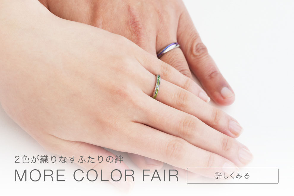 SORAの指輪の色は、構造色といわれるものです。ジルコニウムやチタンに熱や電気を加えると、金属の表面に酸化皮膜が形成されます。その被膜に光が当たり、光が回折や屈折、反射し干渉することで私たちの目に色が見えるのです。