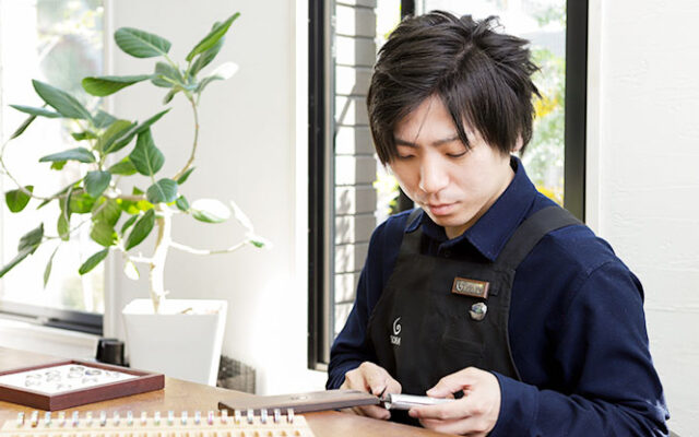 フェアをプロデュースするのは、表参道本店のデザイナー宮越(みやこし)。お客様と会話し理想を叶える結婚指輪づくりを積み重ねてきた経験から、オーダーメイドの楽しさを伝える企画をしています。