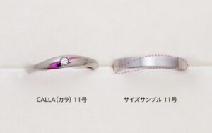 サイズサンプルと実際にオーダーする指輪では、形や幅や厚みが異なる場合があります。