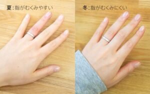 同じ指輪でも、夏は指がむくんでキツく感じやすく、冬はゆるく感じやすくなります。