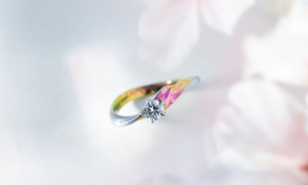春の季語に由来する名のとおり、満開の桜が宵闇を仄かに照らす様子を表現した鮮やかな桜の花びらの上にダイヤモンドが煌めくデザイン。華やかで手元をぱっと明るくする可愛らしい印象にお相手の方との思い出や性格を重ねて贈るのもおすすめな指輪です。