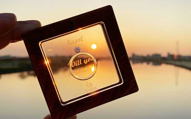 小さな手のひらサイズで、ポケットからスマートに取り出し、箱パカのプロポーズ。大切な想いを伝える小さな木箱だからこそ、質感や見た目にこだわってつくられました。
