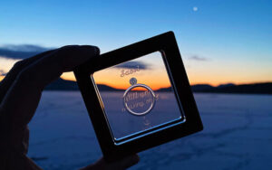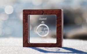 リングが彫刻された透明アクリルには、さらにお名前とメッセージを刻印することができます。