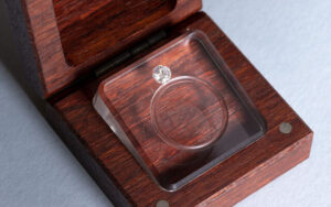 そっと開くと、婚約指輪を想わせるリング状の彫刻の頂点にダイヤモンドが輝き、愛らしい木箱が彼女の手の中でダイヤモンドを一層輝かせます。「あなたの手の中で未来は輝いている」小さな箱に詰まったあなたの強い決意を伝えてます。