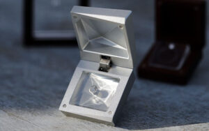 近年、サプライズプロポーズは「ダイヤモンド・プロポーズ」が、主流に加わりつつあります。「サイズが合うか」「デザインを気に入るか」といった婚約指輪に対する不安をなくし、贈ったダイヤモンドでプロポーズ後に一緒に婚約指輪づくりを楽しむことで、さらに絆を深め合うスタイルが人気です。SORAのプロポーズ用ダイヤモンドケースである「ダイアミューズ」は、3種類。「ダイアミューズ・メタル」は、金属の光沢感が魅力の箱型デザインで、クールでインダストリアルな美しさを備えた、誰とも違うサプライズプロポーズを演出します。