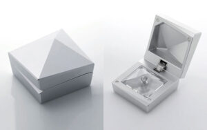 ダイヤモンドの美しいカッティングに呼応するような、アシンメトリーで幾何学的な造形。ケースの中には、同じく多面カットの透明なアクリルの台座が、中央のダイヤモンドの輝きを際立たせます。直線で構成されたシャープなフォルムが、あなたのダイヤモンドのように強固で真っ直ぐな想いを伝えます。