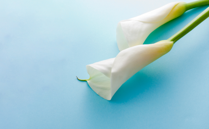 花を包んだ苞が上向きに伸びる凛とした佇まいは、カラー独特の魅力。未来への意志と希望を抱えながら、しなやかに成長していくふたりの姿を重ねています。
