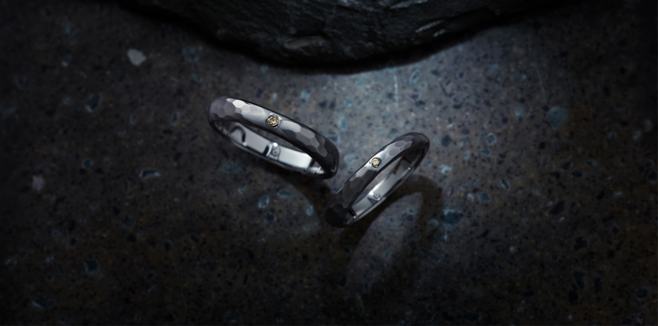 マットな質感の研ぎ目は、おぼろに霞みたなびく雲。中央のブラウンダイヤモンドは、雲間から優しい光を放つ春の月。フォルム全体もやわらかく、指になじむ着け心地です。