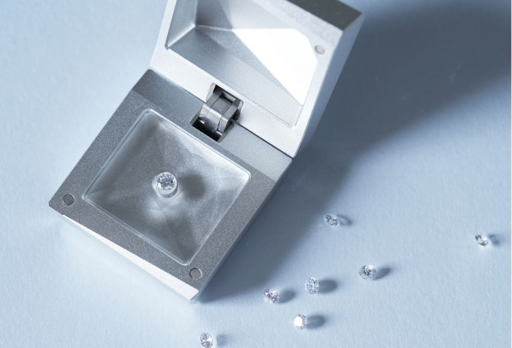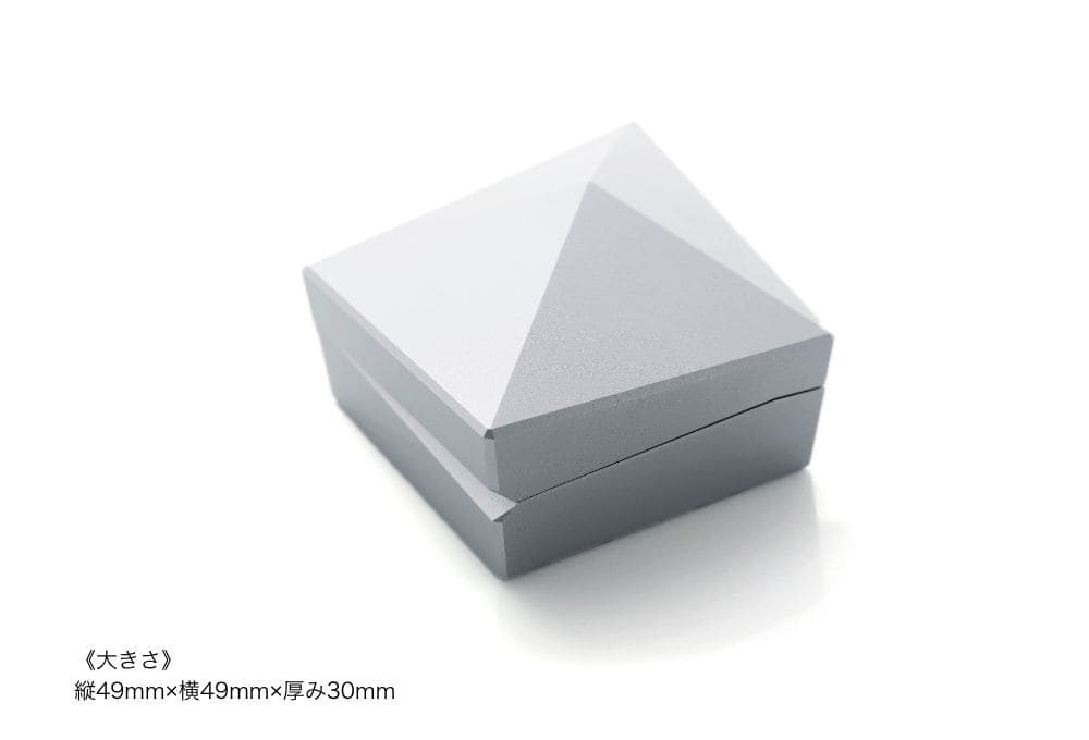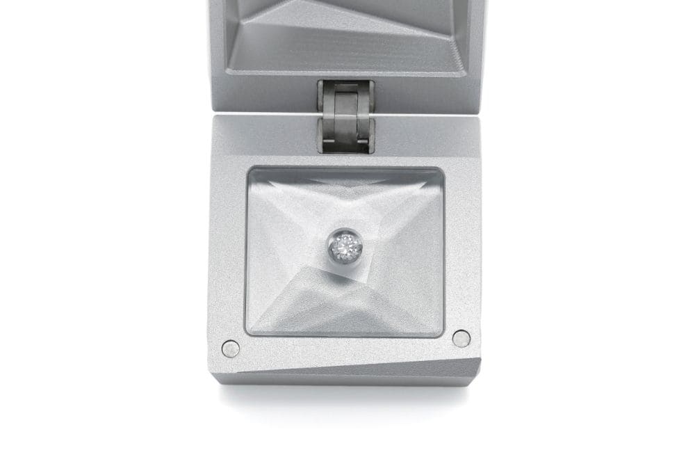 サプライズプロポーズのためのダイヤモンドケース「ダイアミューズ・メタル」は、美しい銀白色と表面の煌めく質感に加え、ダイヤモンドのカッティングに呼応するような、アシンメトリーなデザインが特徴です。ダイアミューズを開けると、多面カットの透明な台座が、中央のダイヤモンドの輝きを際立たせます。