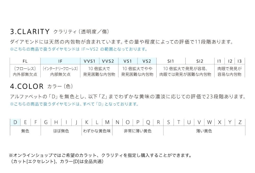 ※オンラインショップではご希望のカラット、クラリティのダイヤモンドをお選びいただき別途購入をお願いいたします。(カット[エクセレント]、カラー[D]は全品共通)