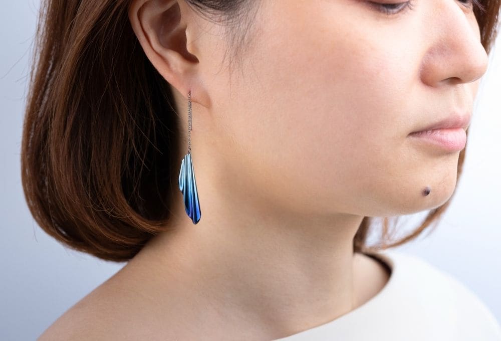 素材は、鮮やかなカラーに色づくジルコニウム。軽く、強度があって金属アレルギー対応の安心で安全な素材です。チェーンも金属アレルギーの起こりにくいチタン製なので安心です。
