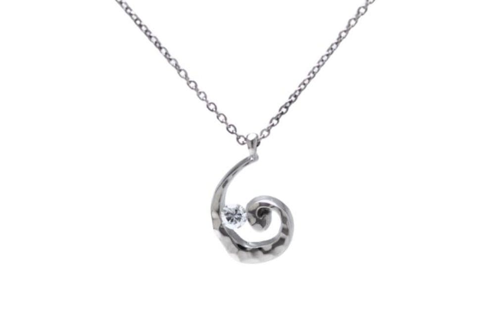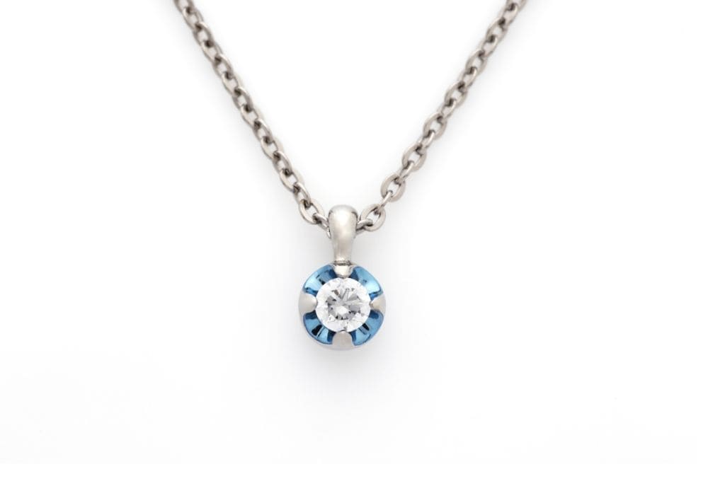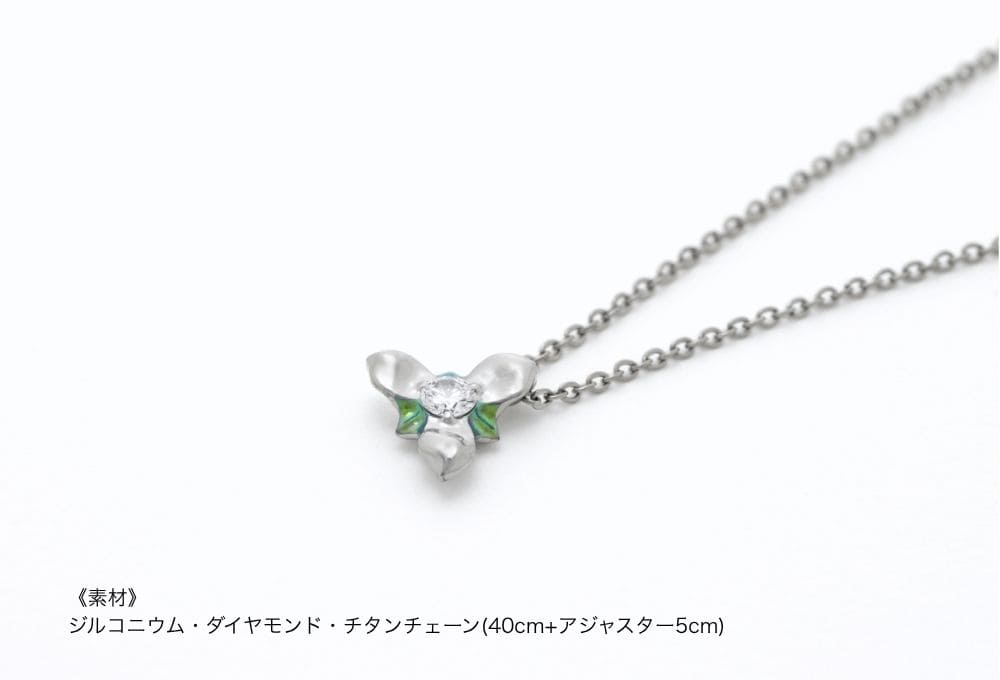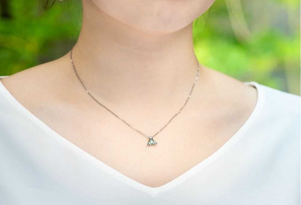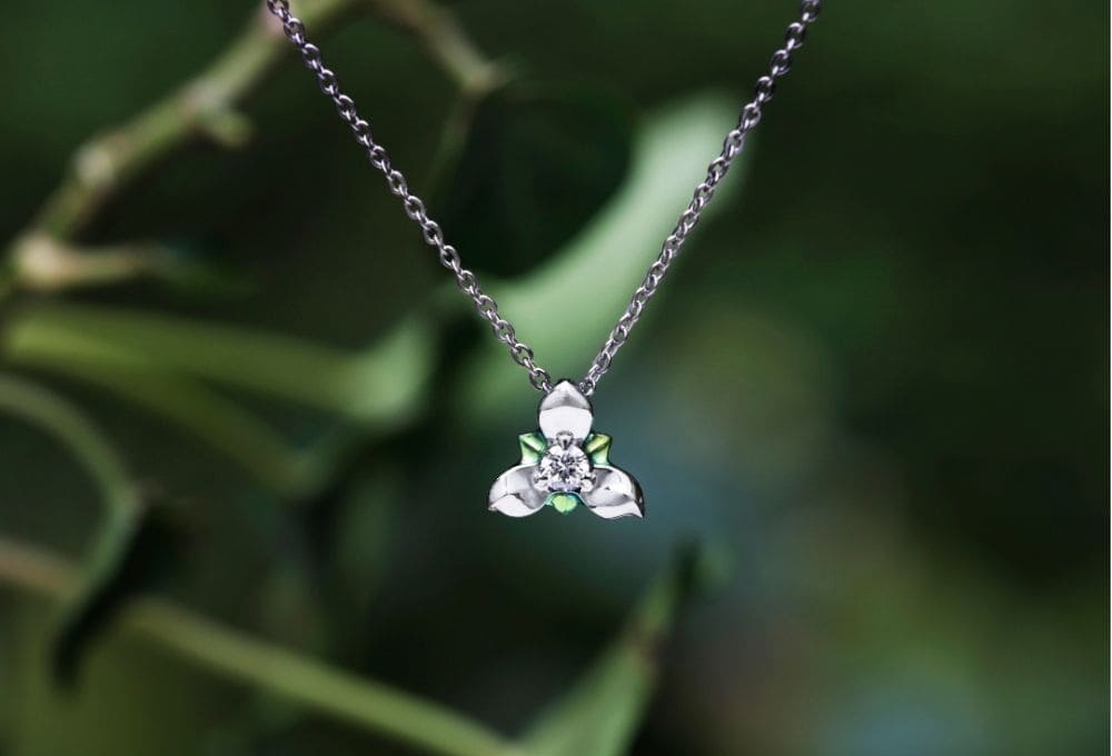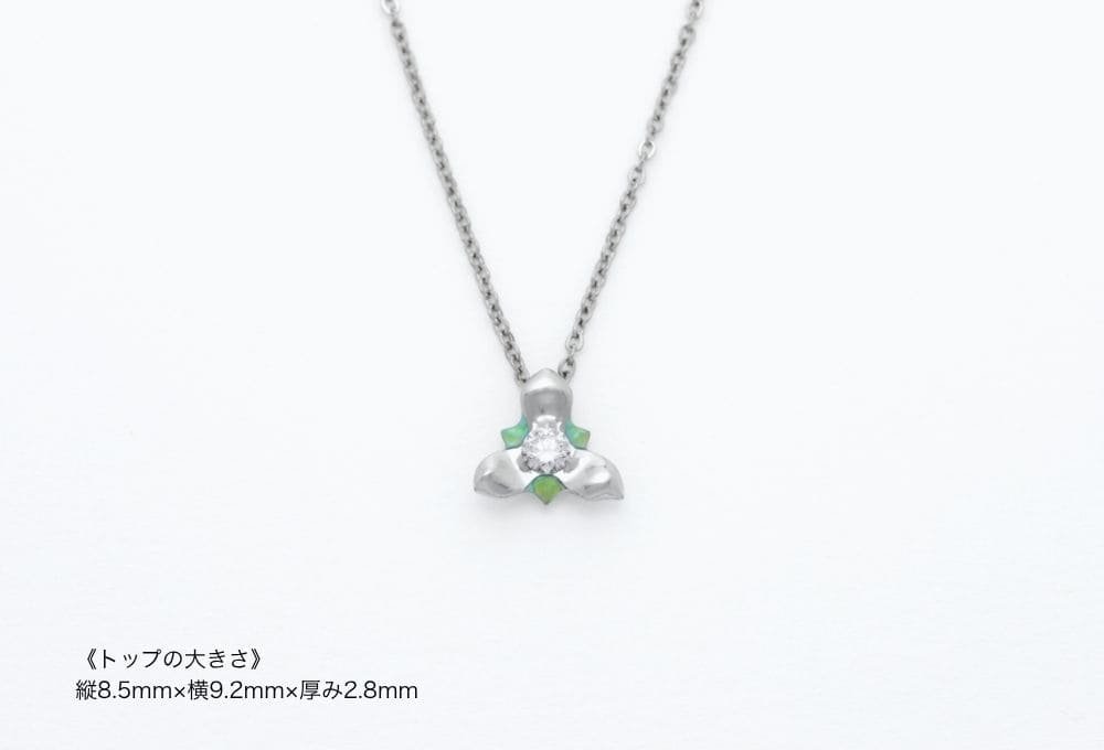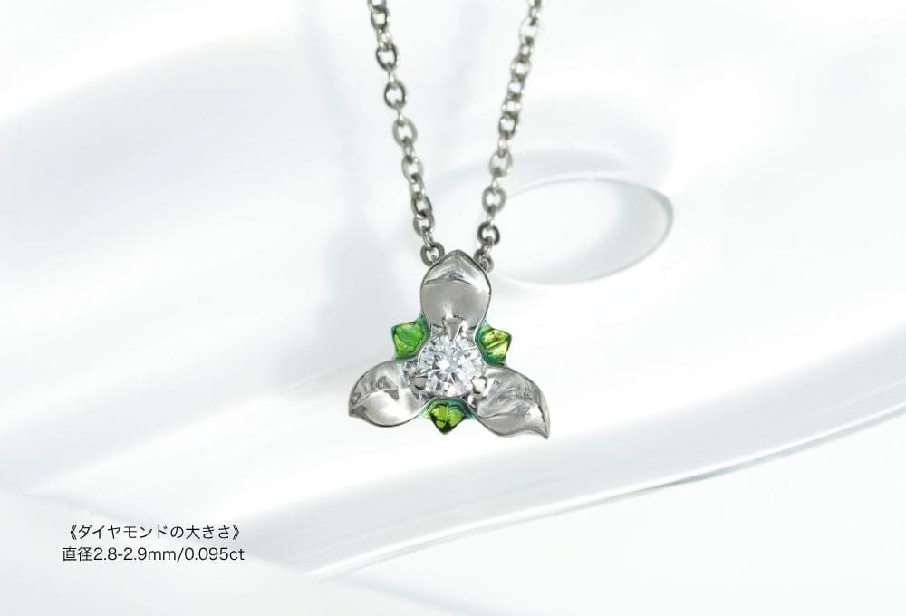中央の輝きに緑色を添えた一粒ダイヤモンドのネックレス。よく見ると、花びらがアシンメトリーになっているところもポイントです。
