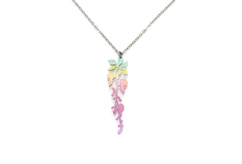 素材は、鮮やかなカラーに色づくジルコニウム。軽く、強度があって金属アレルギー対応の安心で安全な素材です。チェーンも金属アレルギーの起こりにくいチタン製なので安心です。