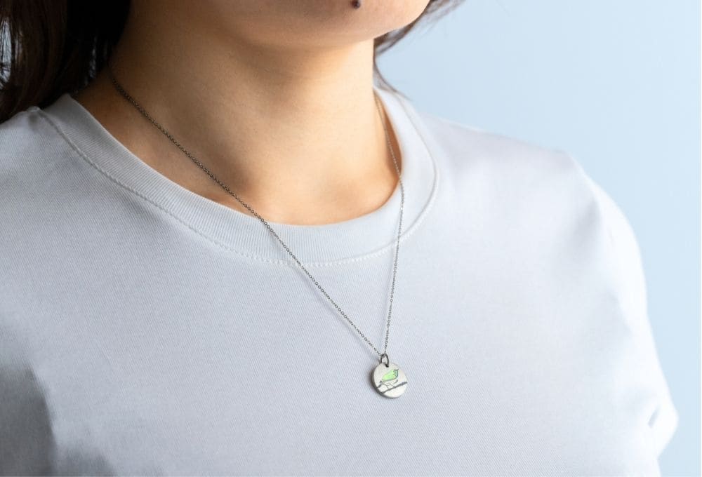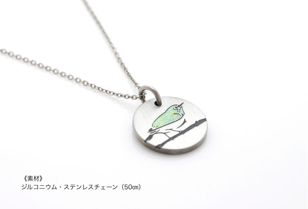 その名の通り目の周りの白い縁取りが特徴のメジロ。早春を告げる黄緑色の鮮やかな姿を再現したオリジナルネックレス「MEJIRO 」には一匹のメジロの姿。視線の先には、つがいのもう一匹がいるのでしょう。同じ枝に詰めて止まる姿から仲睦まじい夫婦の例えに。