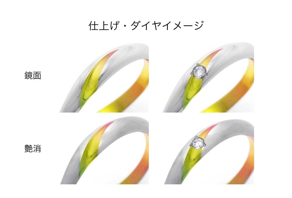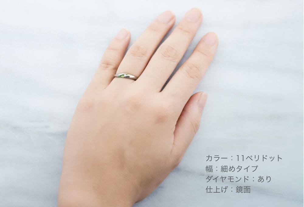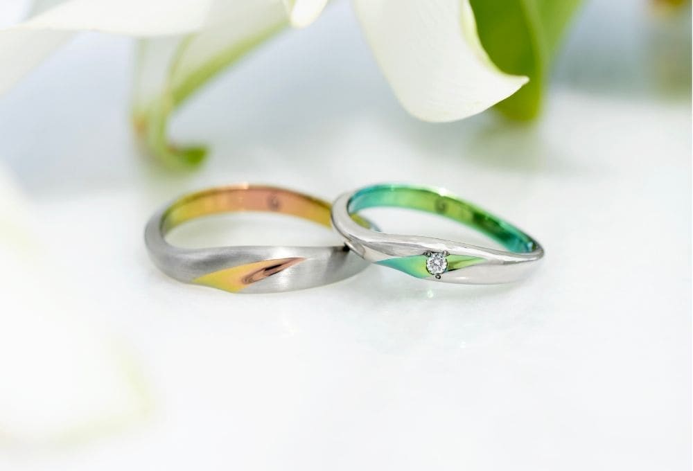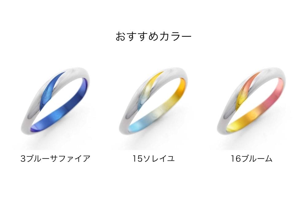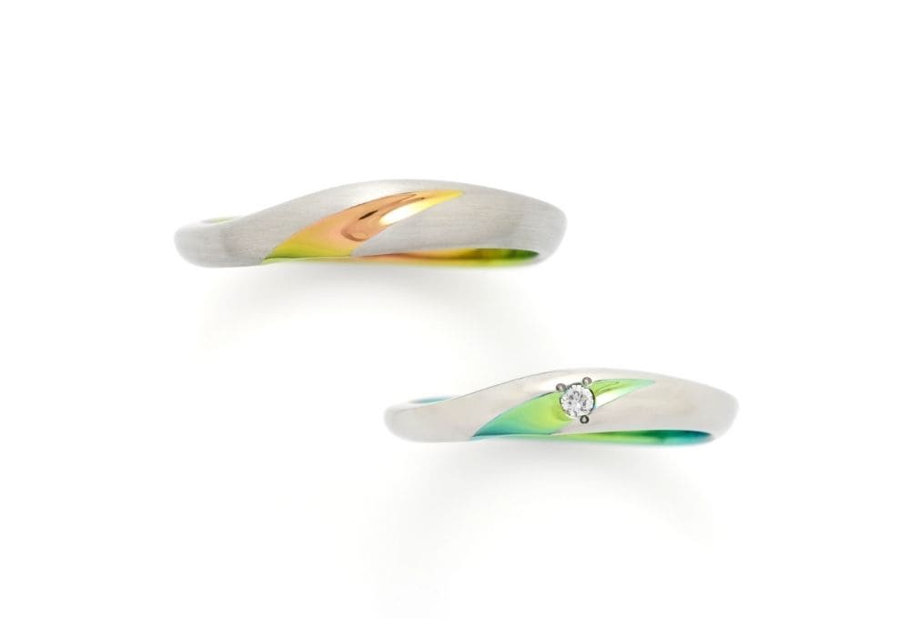 ゆるやかなカーブを描いて斜め上に伸びるライン。ワンポイントで入った色彩が、華やかかつ洗練された印象を指輪に与えます。モチーフはカラーの花。