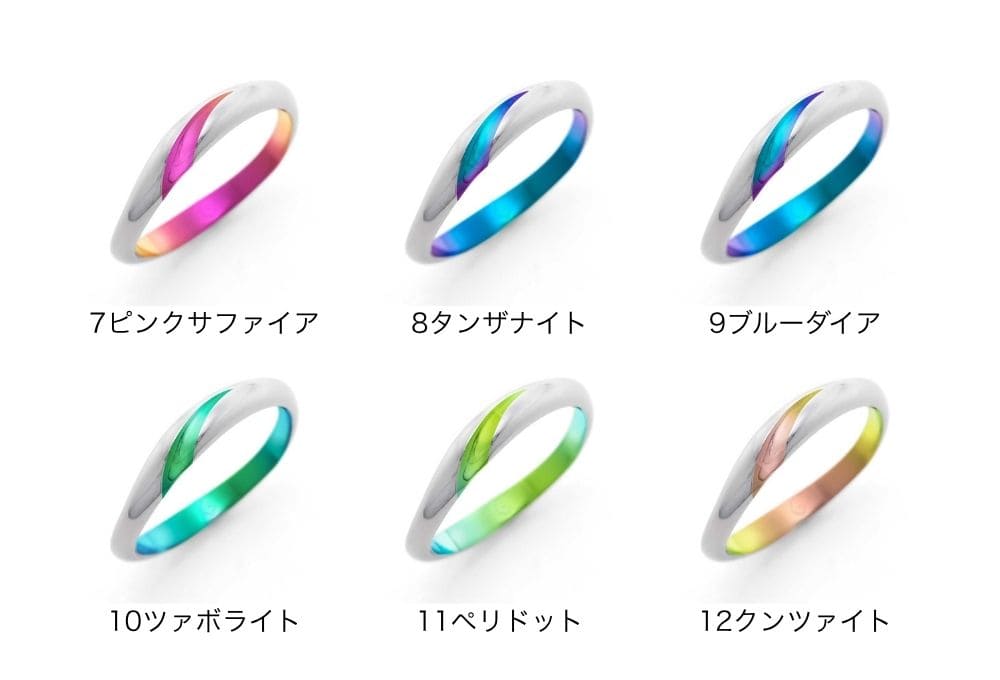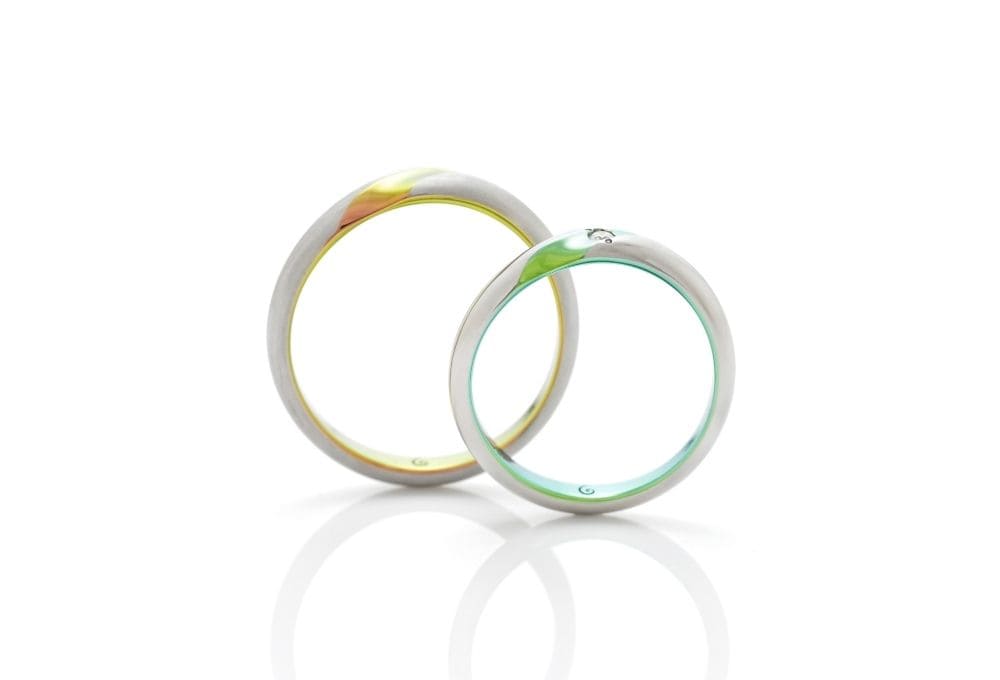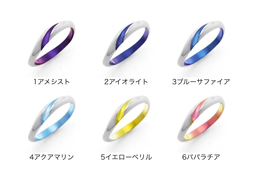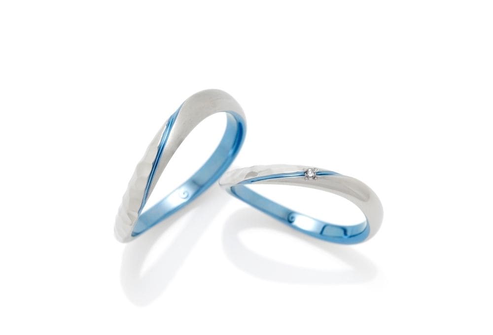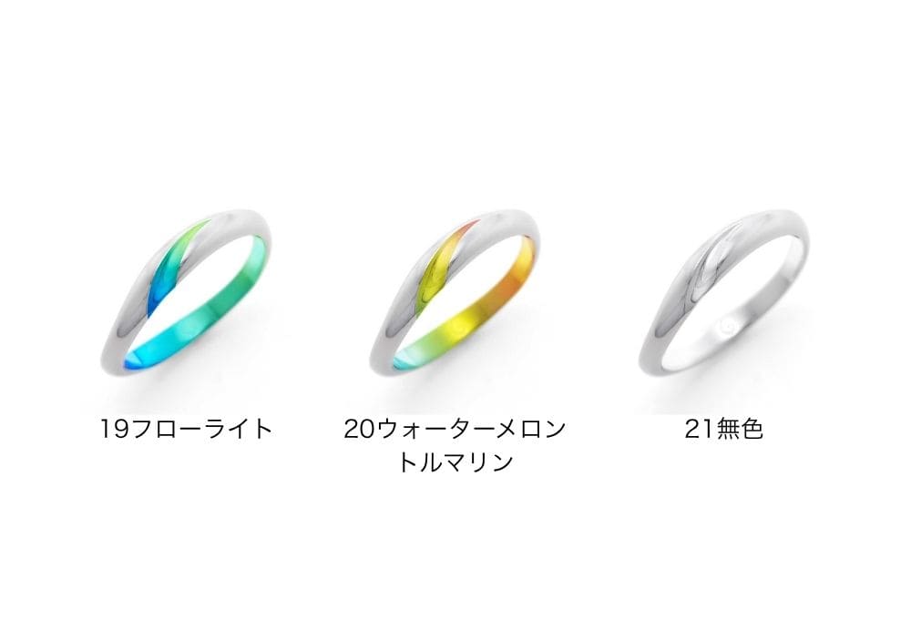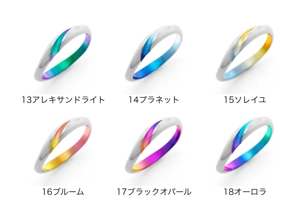 ゆるやかなカーブを描いて斜め上に伸びるライン。ワンポイントで入った色彩が、華やかかつ洗練された印象を指輪に与えます。モチーフはカラーの花。