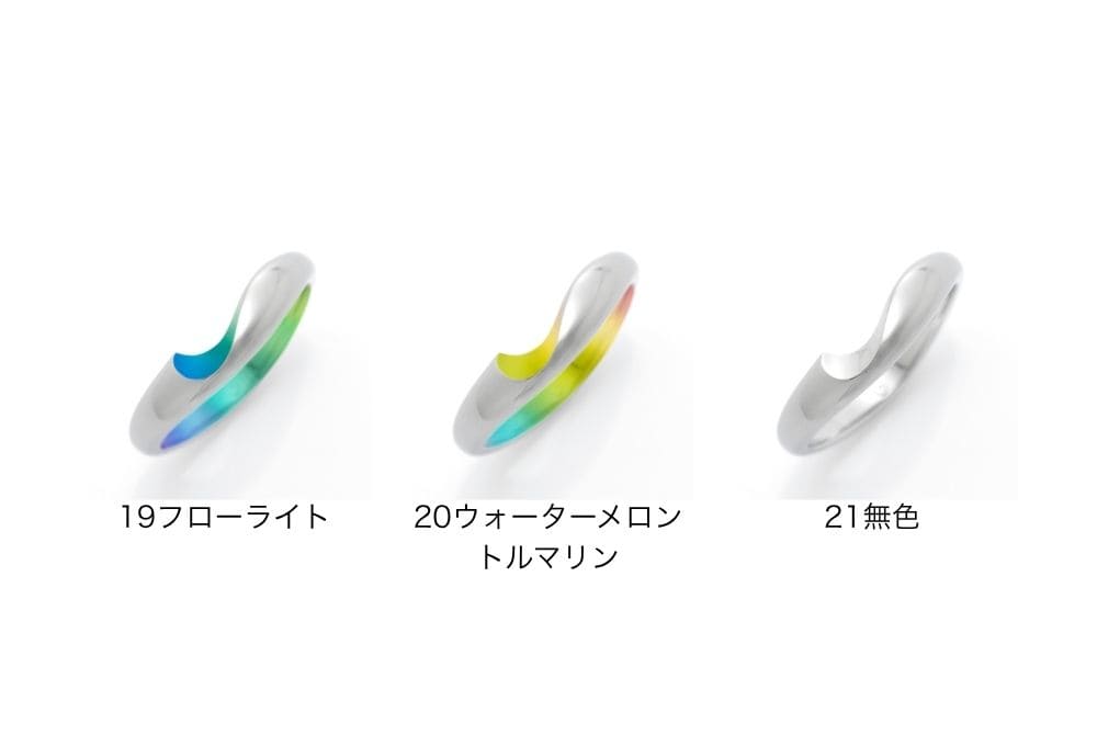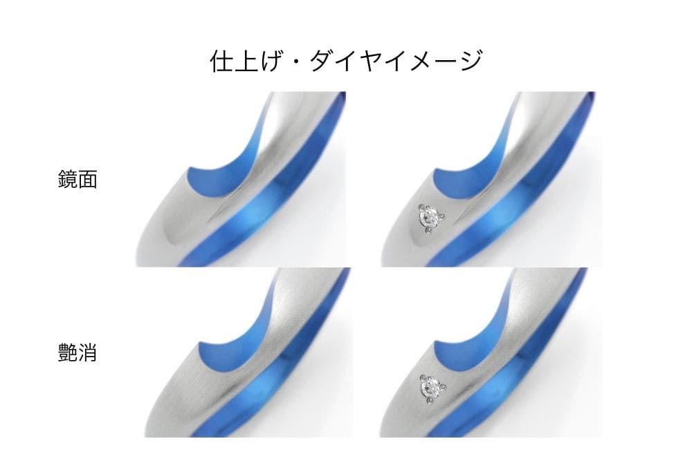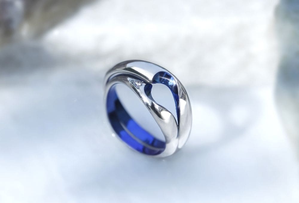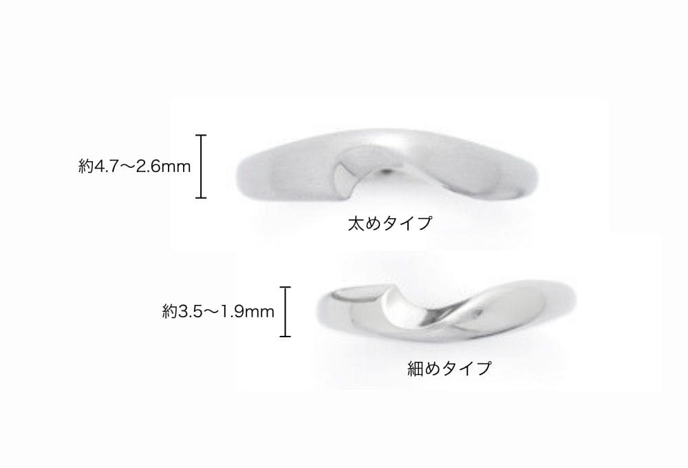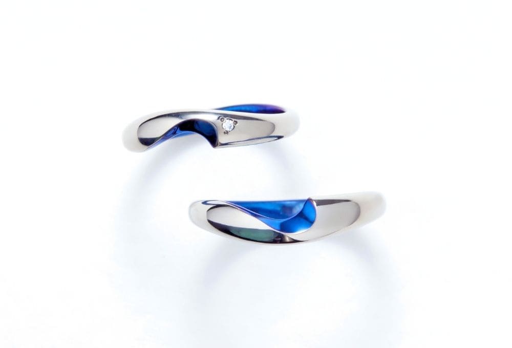 丸みを帯びたフォルムの一部を大きく削り取り、弾ける波を表現したデザイン。二本の指輪を並べると、向かい合わせになった波がハートを描きます。