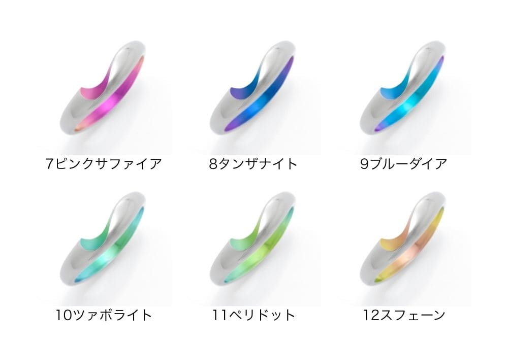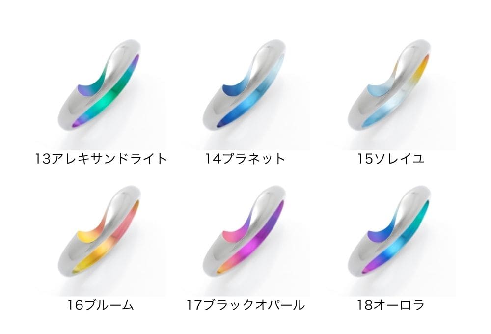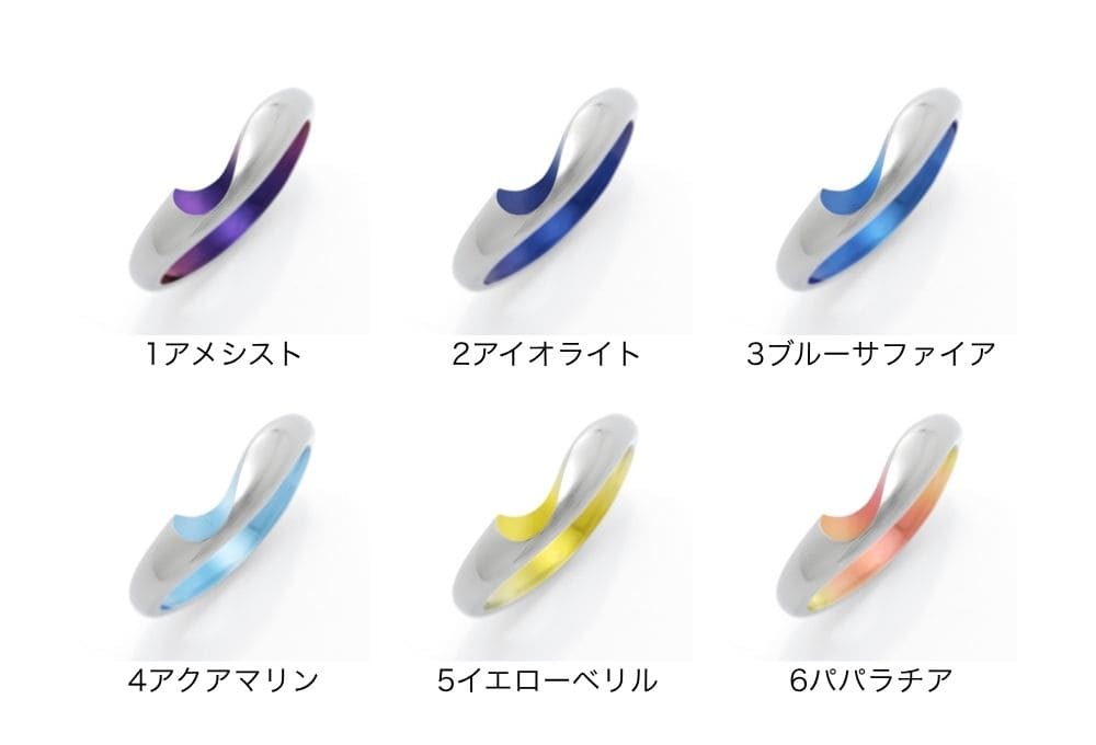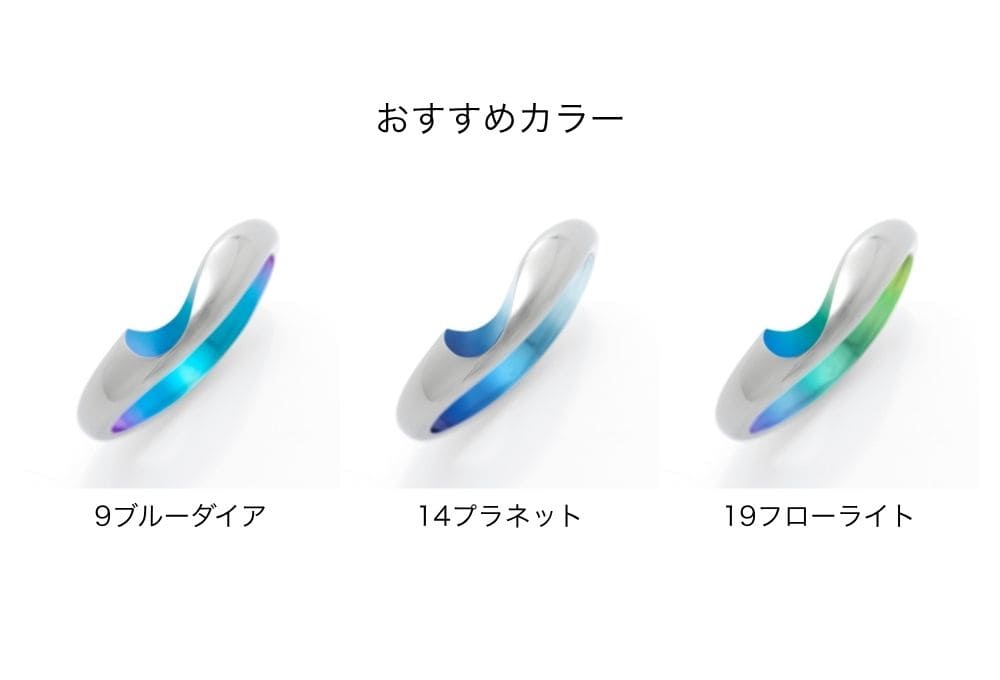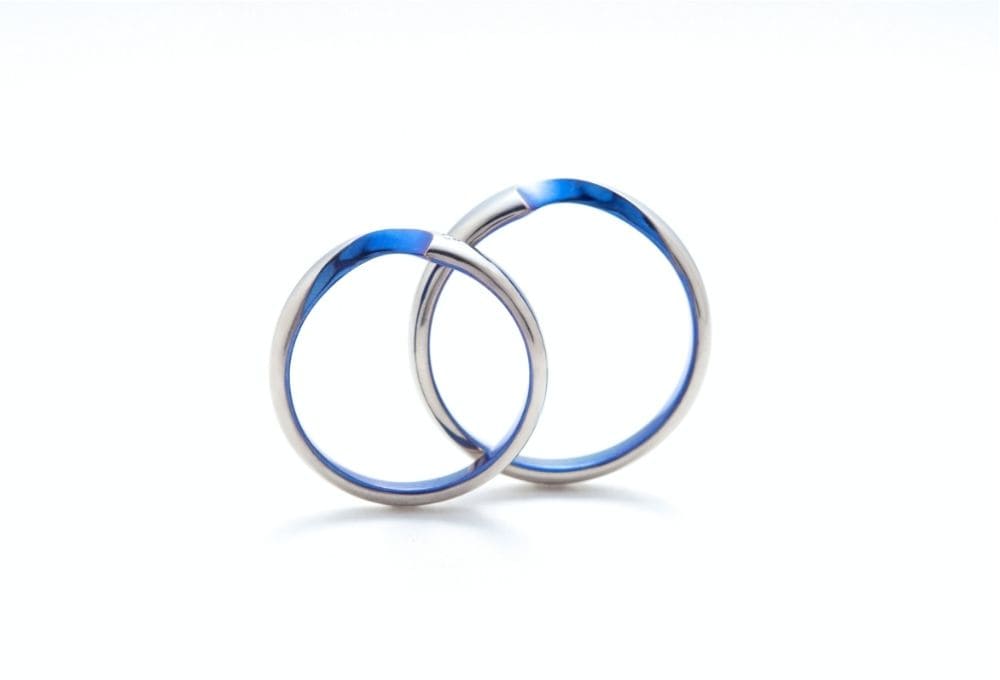 丸みを帯びたフォルムの一部を大きく削り取り、弾ける波を表現したデザイン。二本の指輪を並べると、向かい合わせになった波がハートを描きます。
