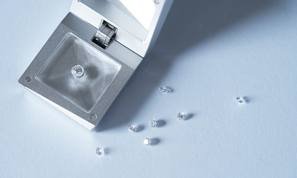サプライズプロポーズのためのダイヤモンドケース「ダイアミューズ・メタル」は、美しい銀白色と表面の煌めく質感に加え、ダイヤモンドのカッティングに呼応するような、アシンメトリーなデザインが特徴です。ダイアミューズを開けると、多面カットの透明な台座が、中央のダイヤモンドの輝きを際立たせます。 手のひらに収まるサイズ感で、パートナーに気付かれることなくポケットに忍ばせることができ、プロポーズの瞬間をスマートに演出します。