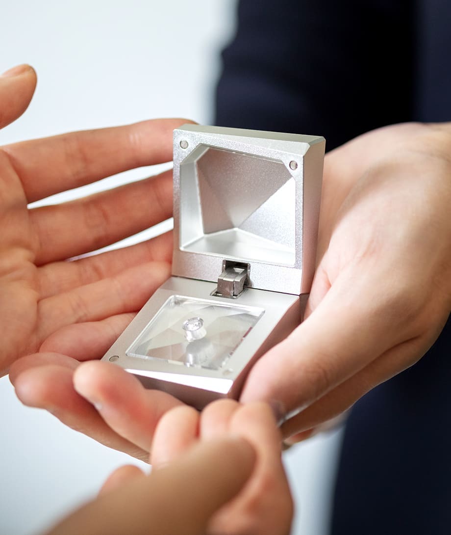 サプライズプロポーズのためのダイヤモンドケース「ダイアミューズ・メタル」は、美しい銀白色と表面の煌めく質感に加え、ダイヤモンドのカッティングに呼応するような、アシンメトリーなデザインが特徴です。ダイアミューズを開けると、多面カットの透明な台座が、中央のダイヤモンドの輝きを際立たせます。 手のひらに収まるサイズ感で、パートナーに気付かれることなくポケットに忍ばせることができ、プロポーズの瞬間をスマートに演出します。