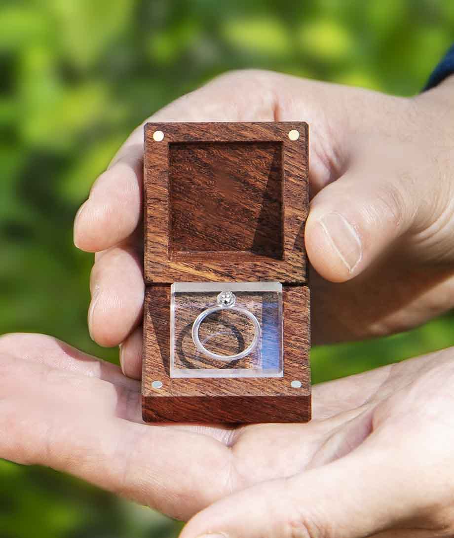 SORAの工房で生まれたダイアミューズシリーズ第3弾は、憧れの「箱パカ」に焦点を絞って、改良された新モデル。 ポケットに入るミニマムサイズ、スマートに箱を開けるための工夫、ダイヤモンドを美しく見せるリングの彫刻。ぬくもりある木の上質感、透明感溢れる台座でダイヤモンドの輝きを引き立てるダイアミューズで、記憶に残る最高のプロポーズを。 ポケットから取り出し、パカッとひらくと、目の前で一粒のダイヤモンドがきらめきます。 プロポーズの際には、「一緒にふたりだけの婚約指輪をつくろう」と言葉を添えて。