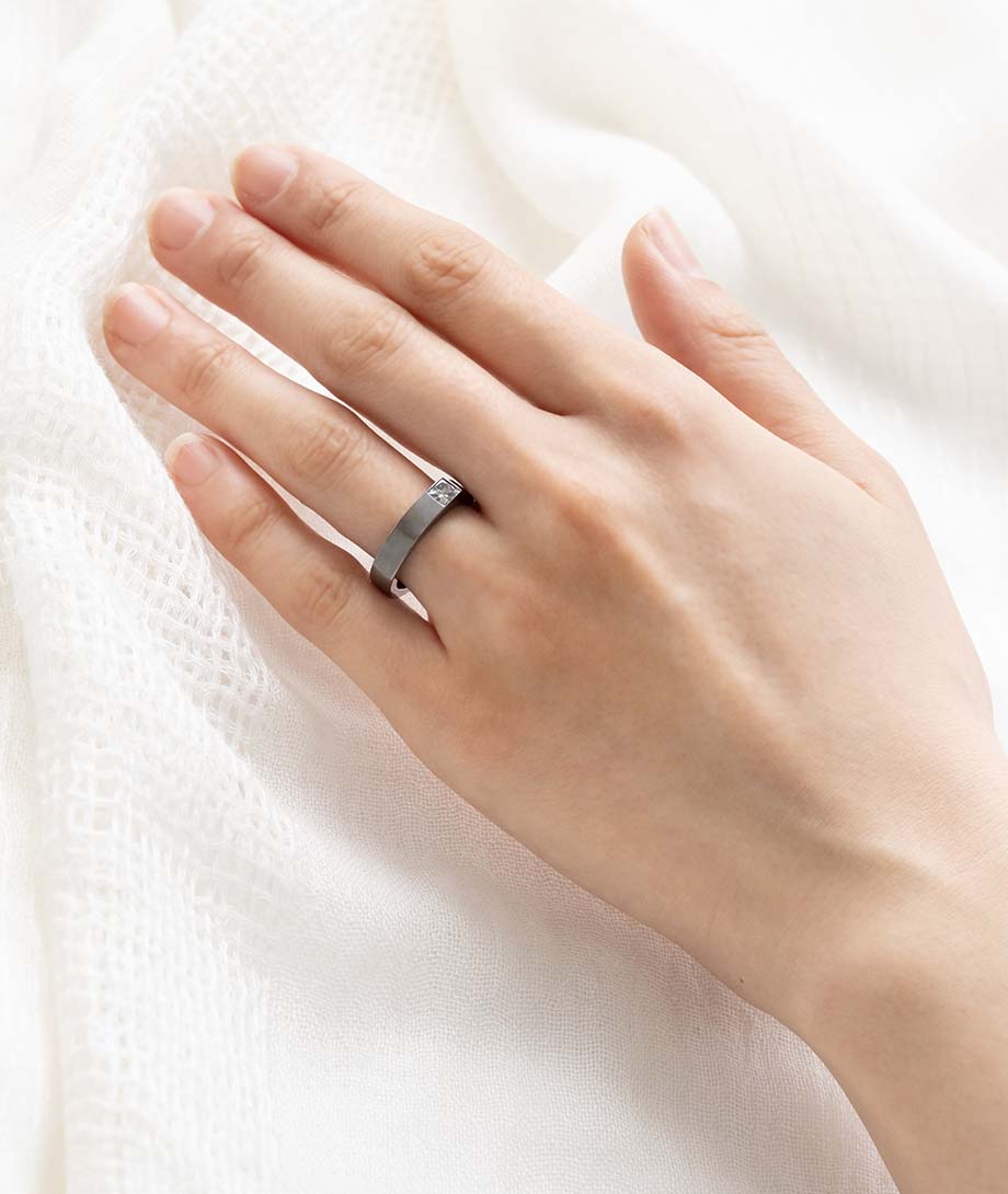 プリンセスカットのダイヤモンドが指の間で煌めく、個性的なデザイン。タンタルの黒く落ち着いた色調が、クールな印象をさらに引き立てます。