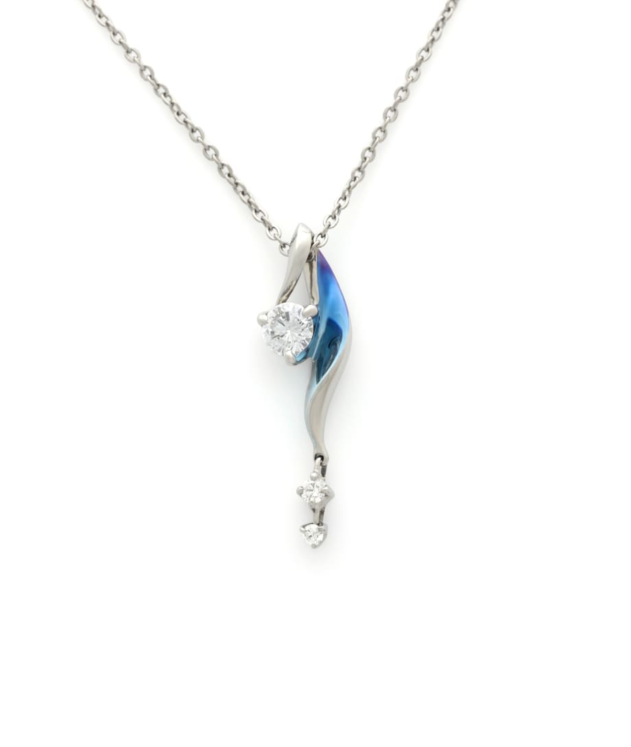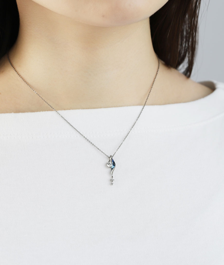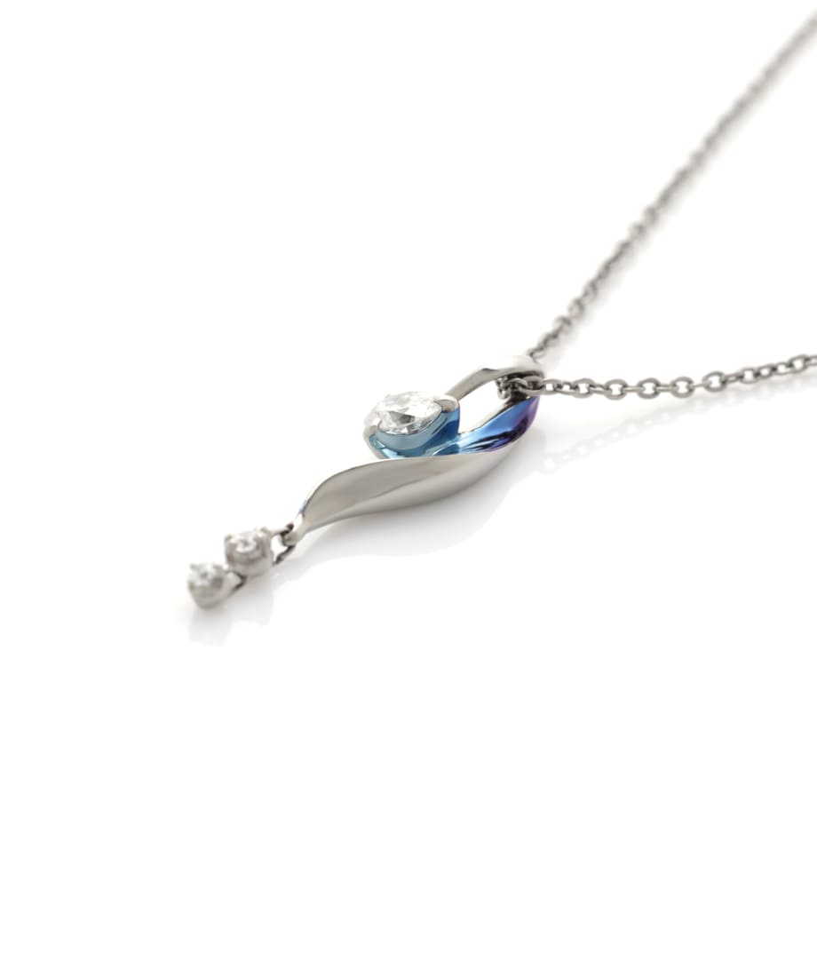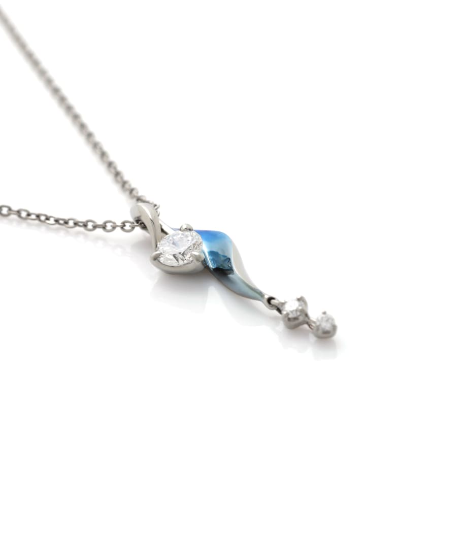ふわりと流れるようなひねりのあるフォルムに、ダイヤモンドが揺れるネックレス。冬の冴えた風に運ばれる雪の結晶を表現しています。