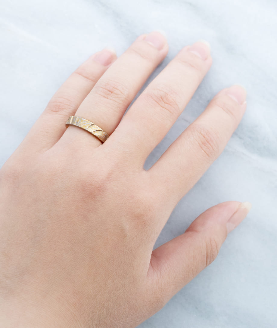 木目模様と表面のテクスチャーで、木肌をリアルに再現したデザイン。見るたびにほっとするような、ぬくもりを感じさせる指輪です。