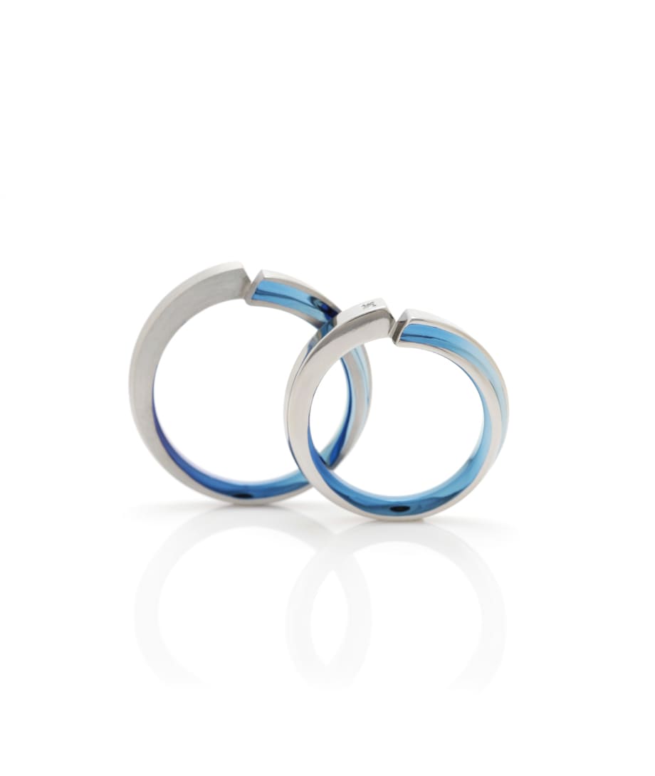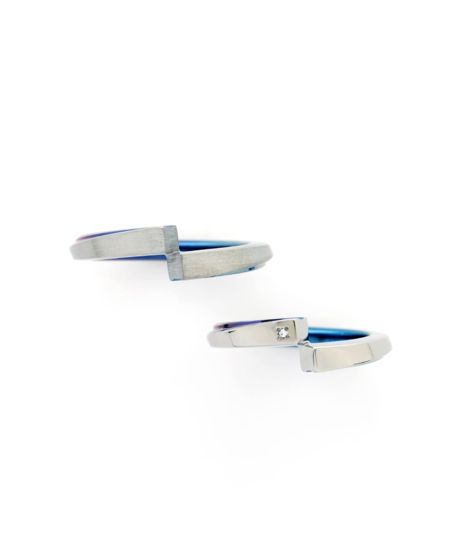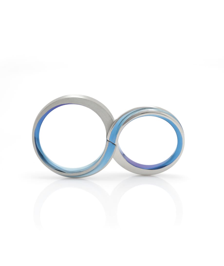指輪を合わせると現れる無限のフォルム。さらに、発色ラインが表と裏を巡って無限軌道を描きます。指の腹側にくる部分は細く薄いため、指あたりのよい形です。