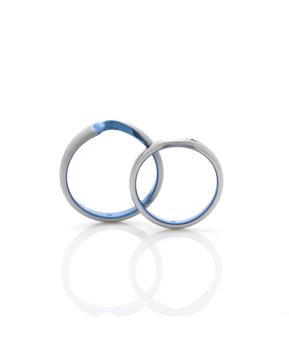 丸みを帯びたフォルムの一部を大きく削り取り、弾ける波を表現したデザイン。二本の指輪を並べると、向かい合わせになった波がハートを描きます。