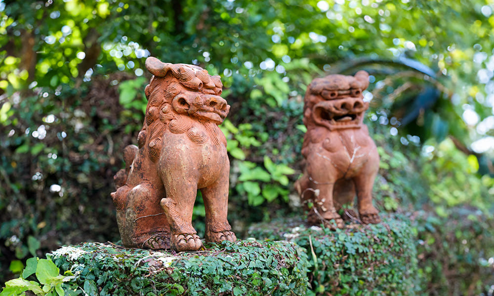 口を開けた一体は福を呼び込み、閉じた一体は福を逃がさず留めるというシーサー。一対で役割を果たす守り神に、支え合って歩んでいくふたりの姿を重ねて。