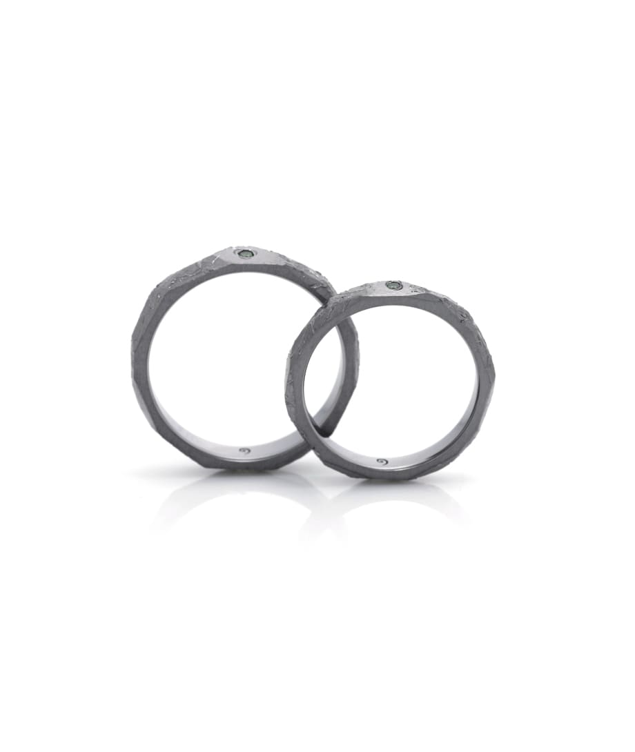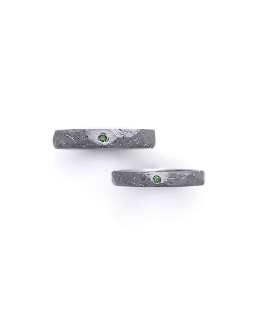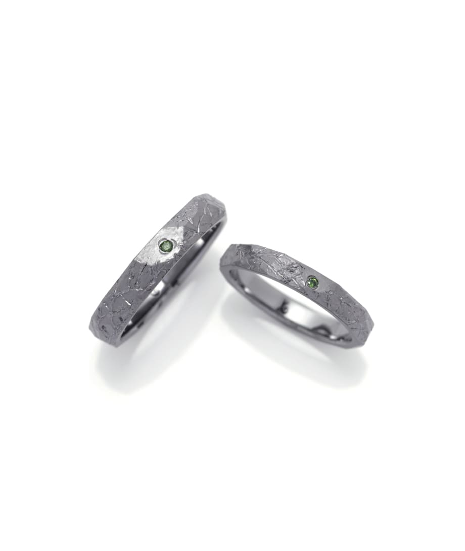 ゴツゴツした表面に枝のテクスチャーを施して夜の森を表現。無骨な雰囲気が魅力のデザインです。グリーンダイヤモンドは梢の向こうに見える月を表しています。